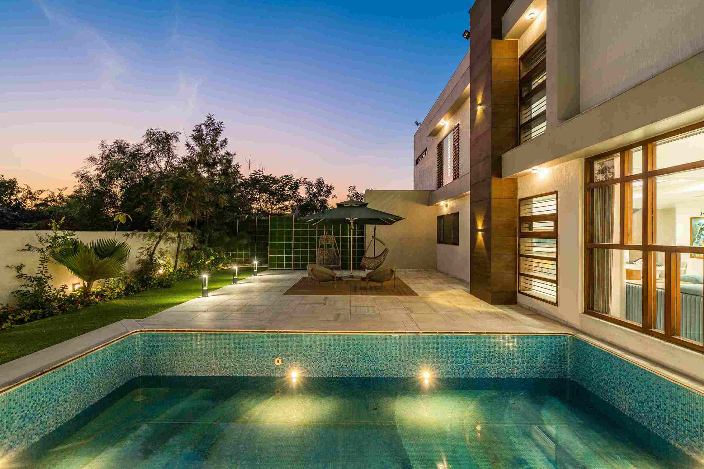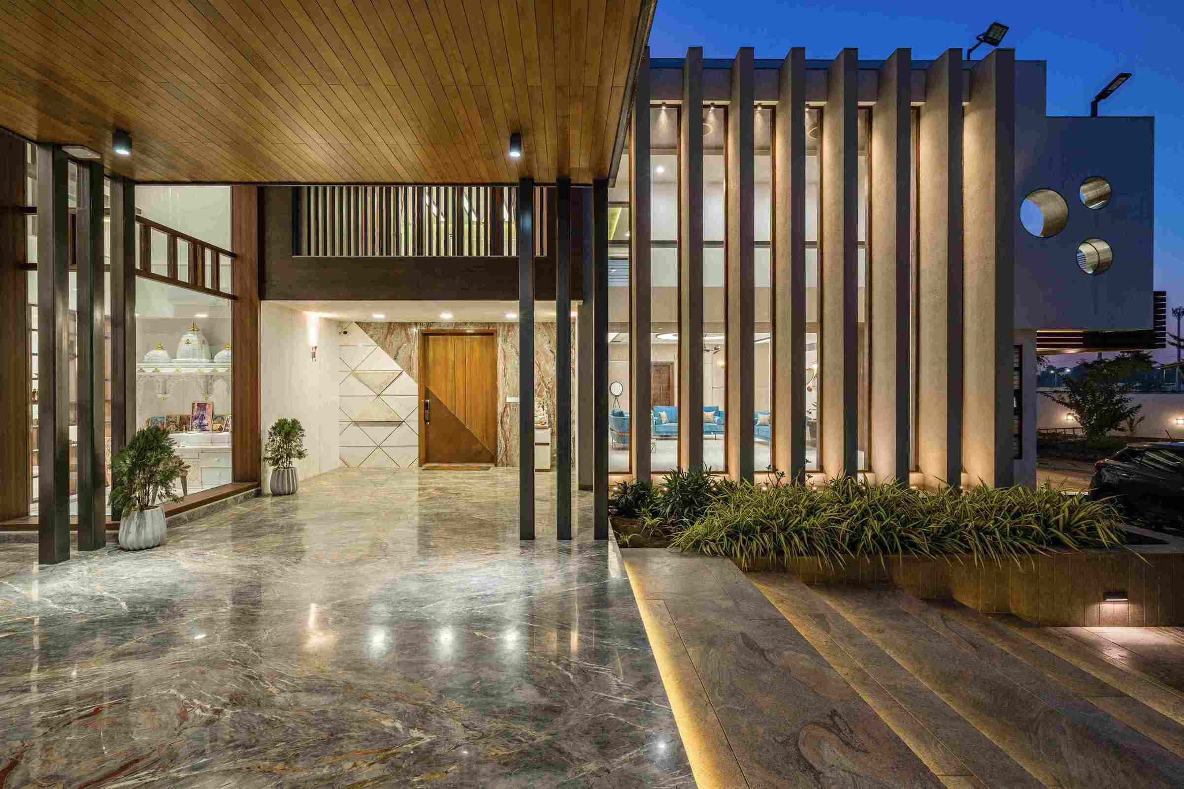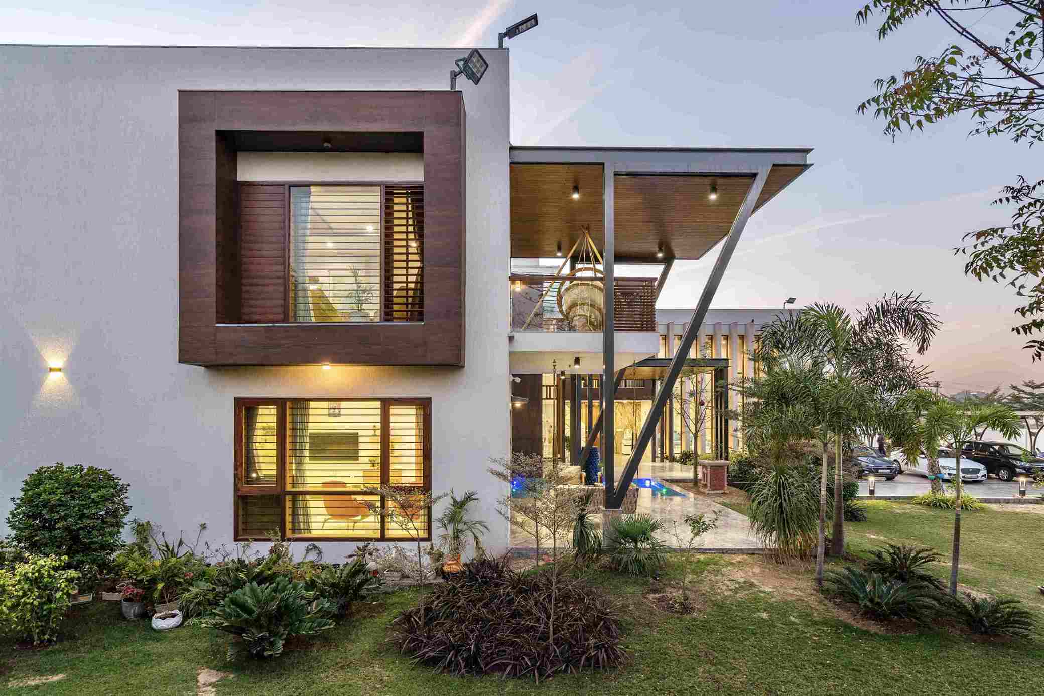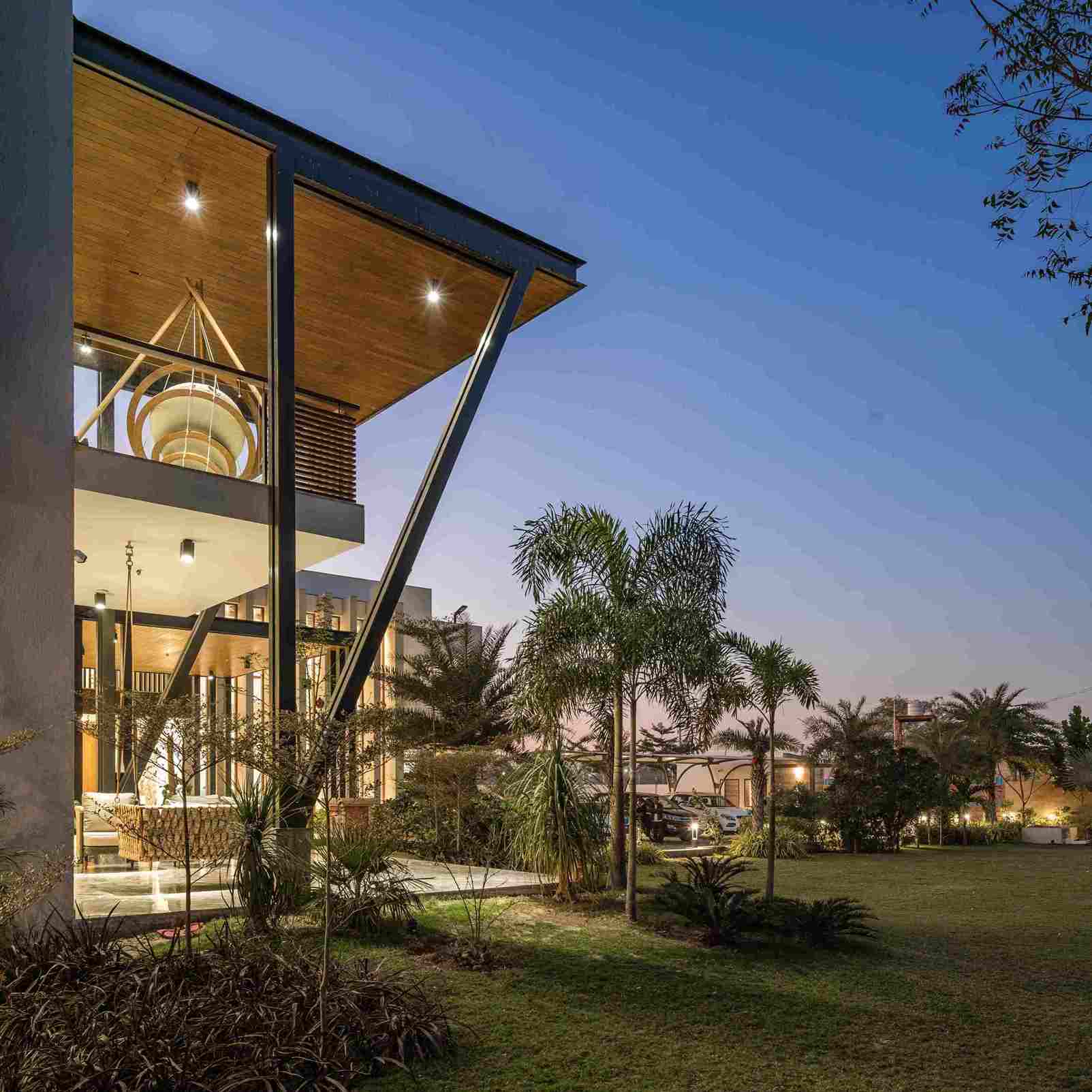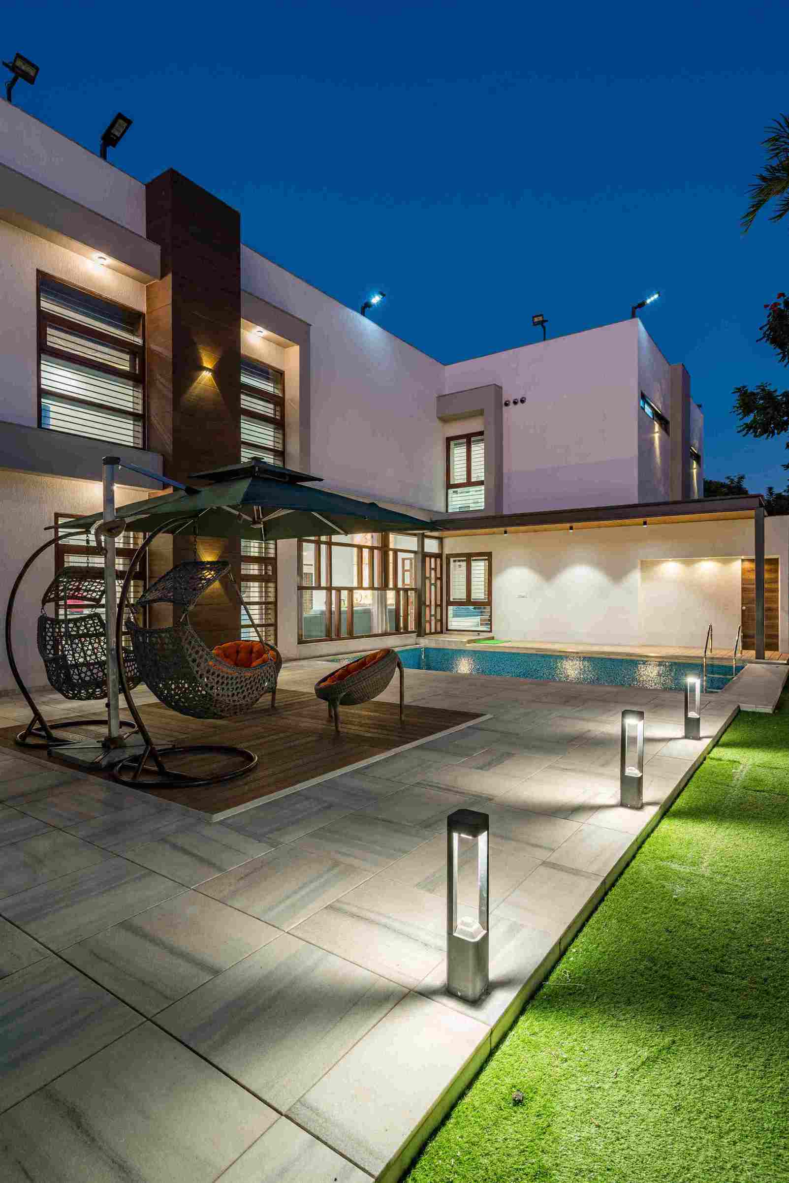 The residence is located in Ahmedabad. The volumes are achieved by the play of mass and void, which creates the pockets of spaces that are utilized for landscape which intern enhances the architecture of the house. The house is at a setback of 25m which accommodates parking and a foyer. Site area of 3000 sq. yards which has a total built-up area of 1100 sq. yards. Also consists of a swimming pool in the backyard with a wooden deck. The foyer is located at the center of the public spaces of the houses. The entrance leads to the primary spaces of the house via a porch connecting with a waterbody and courtyard. One of the key elements is a glass and wooden bridge that is connecting to the master bedroom overlooking the living room. It also features a 5 ft cantilever staircase supporting on a 9-inch R.C.C wall. Most of the enclosed spaces at the lower level are connected with a semi- open space overlooking the landscape. The orientation of the spaces is in a way that optimizes circulation.
