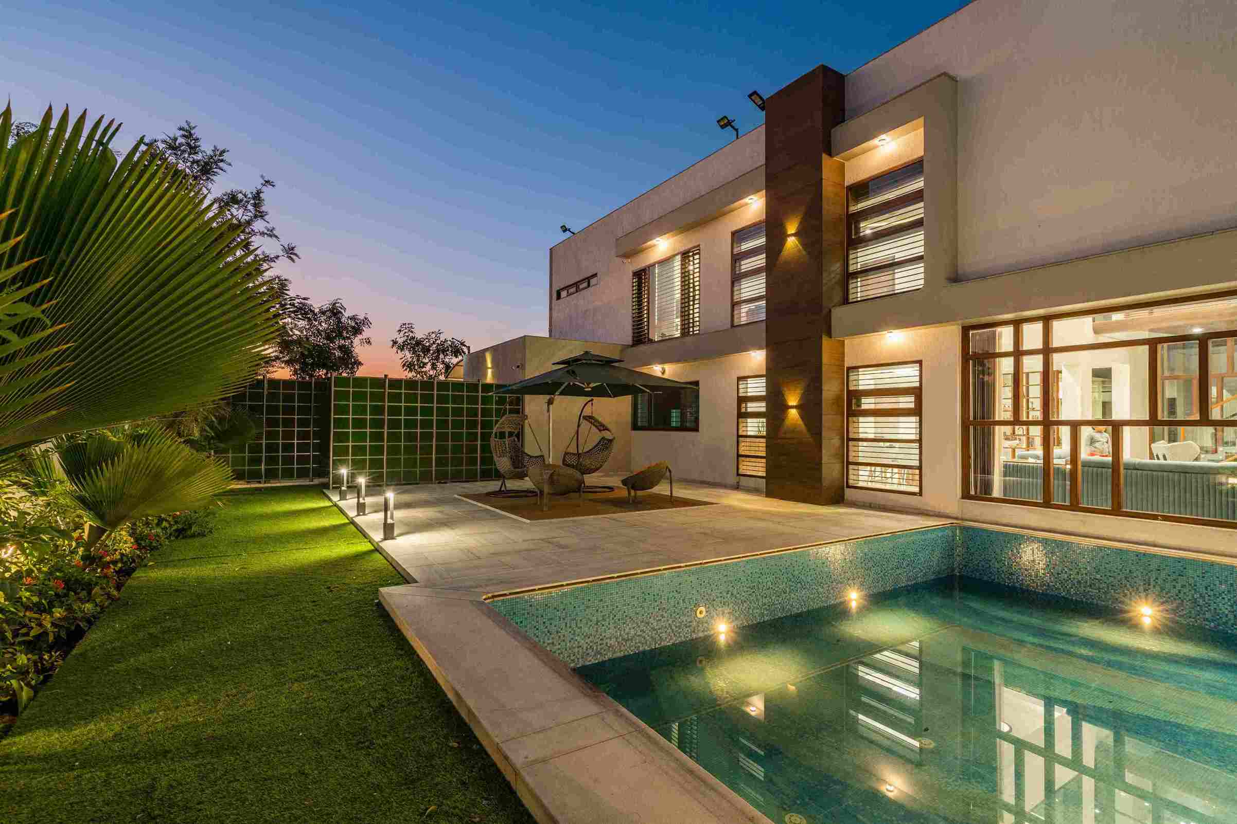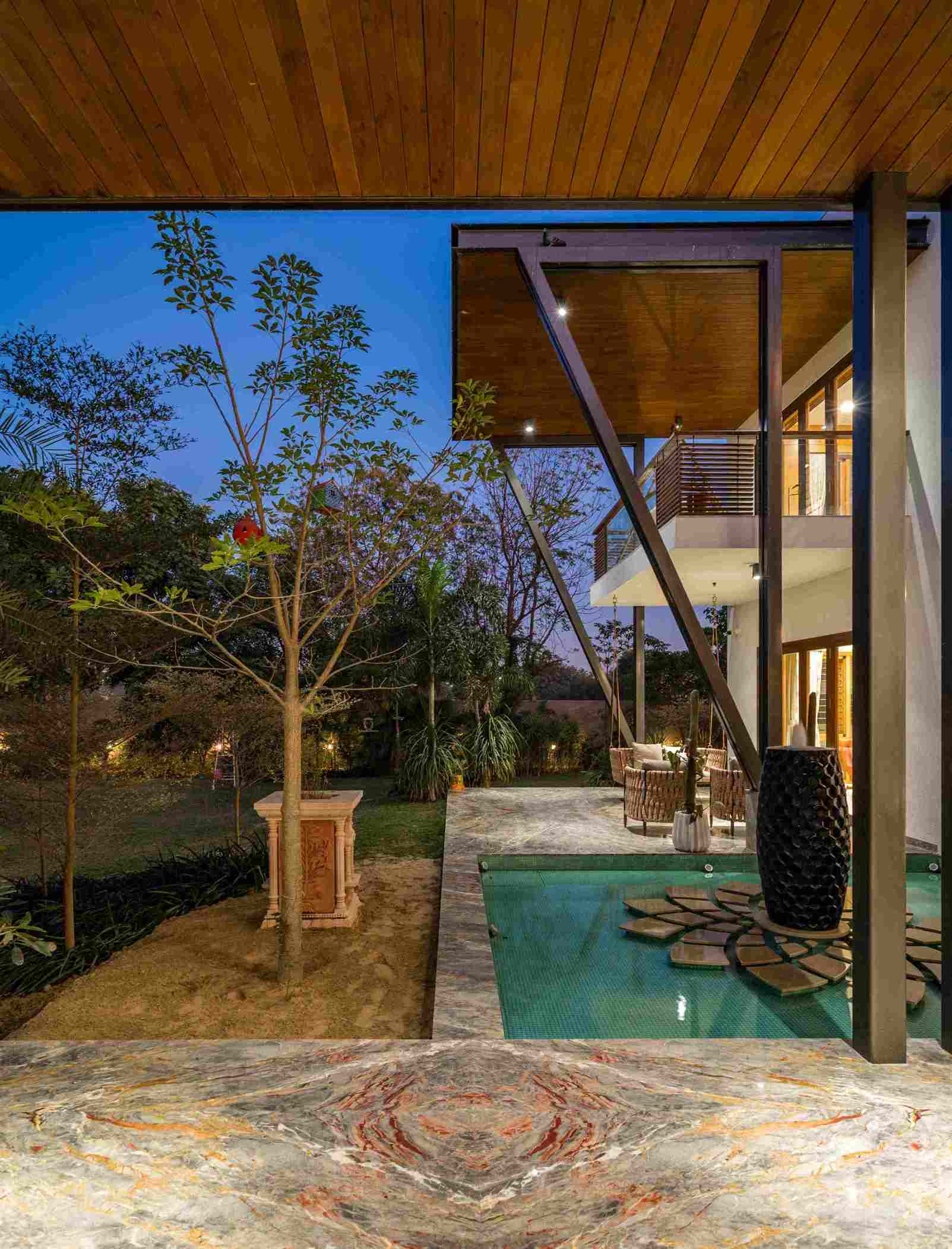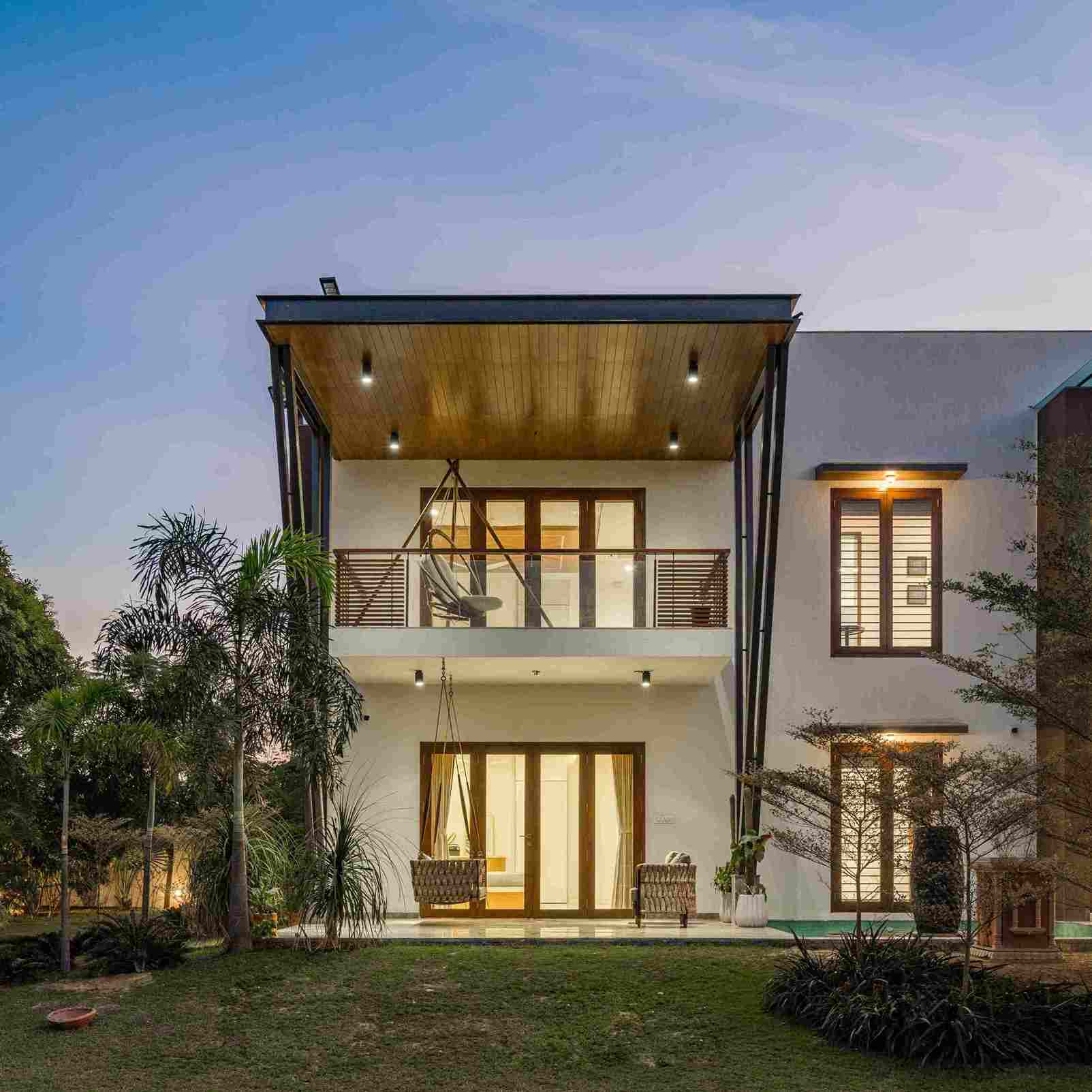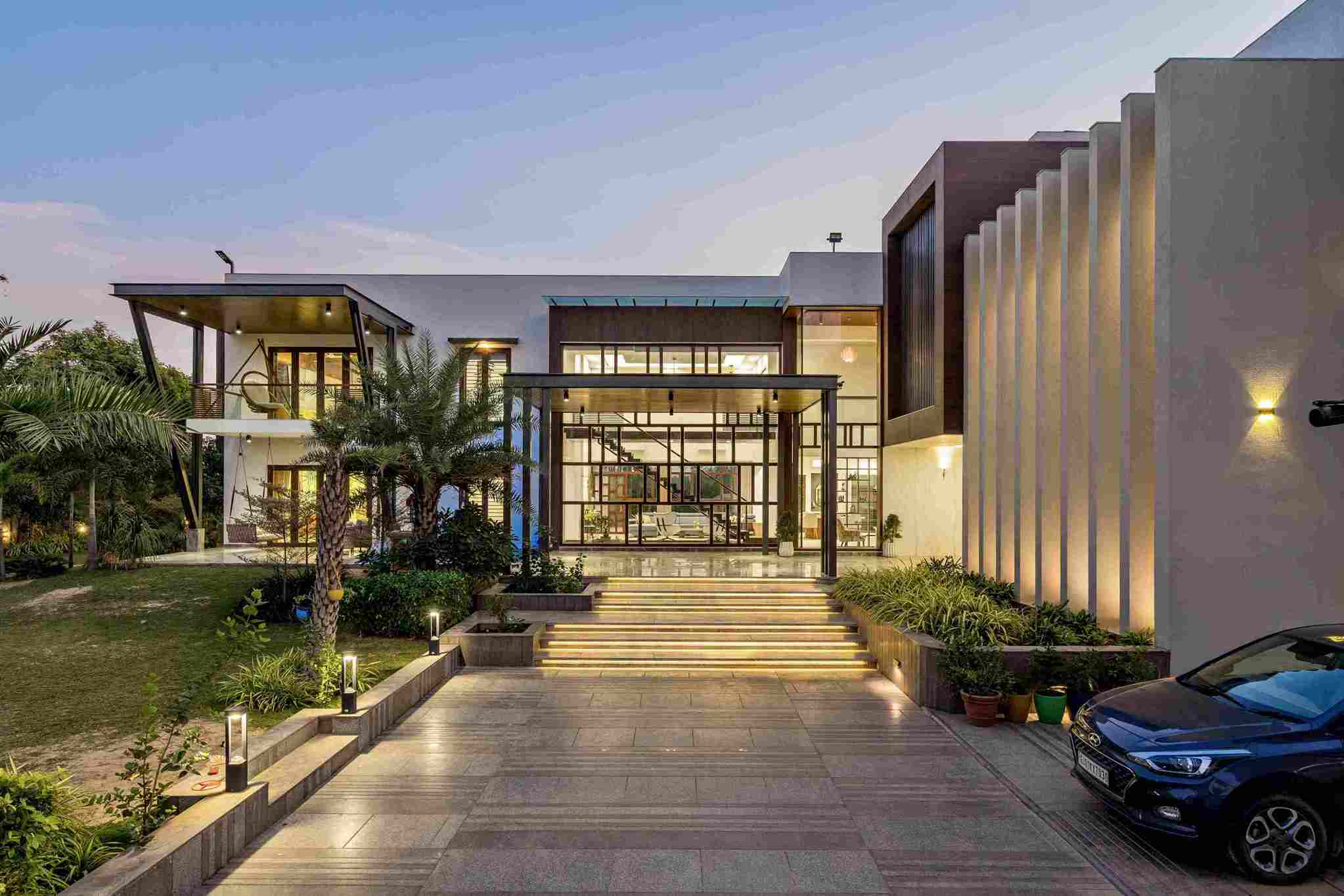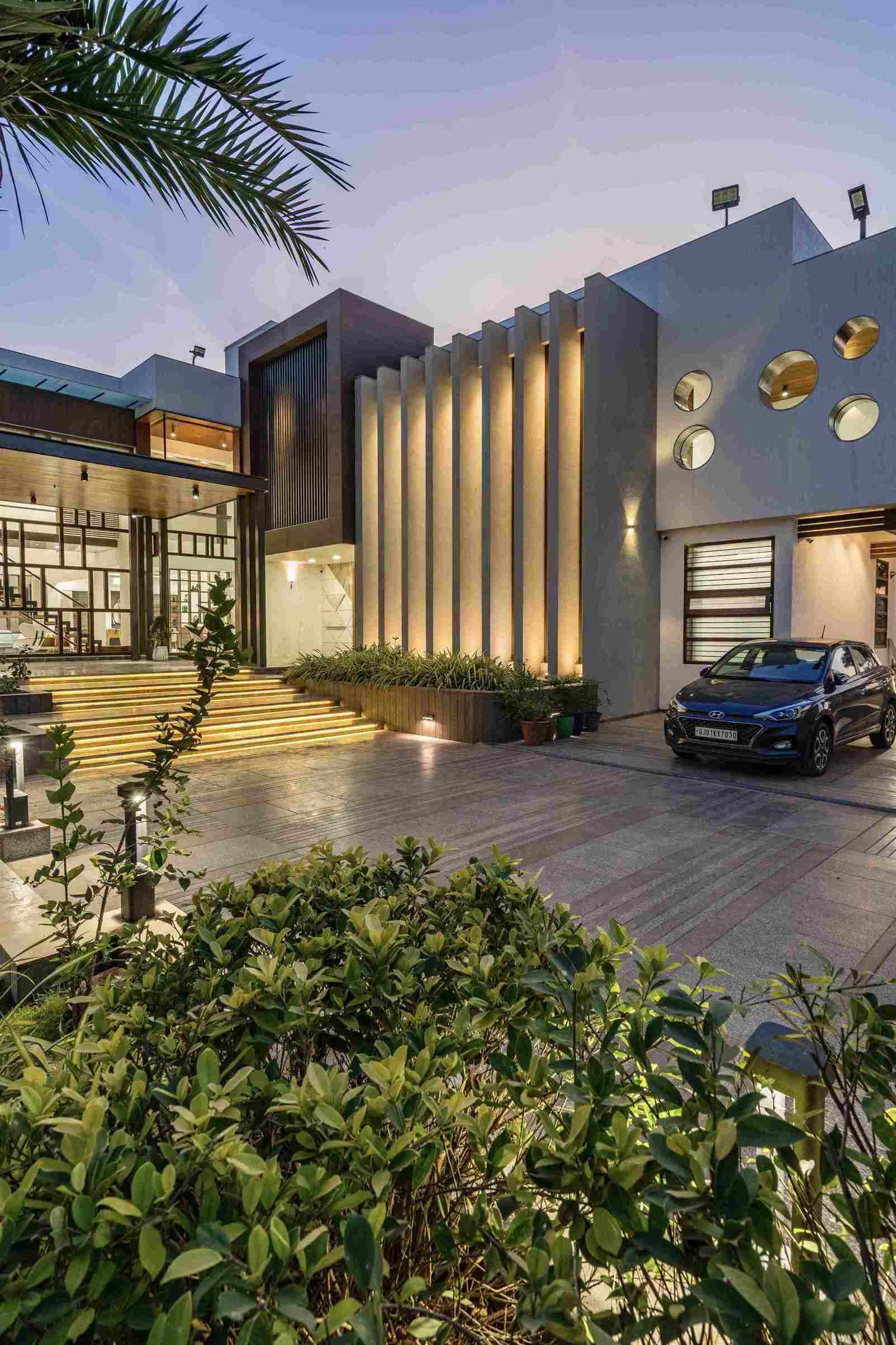 The residence is located in Ahmedabad. The volumes are achieved by the play of mass and void, which creates the pockets of spaces that are utilized for landscape which intern enhances the architecture of the house. The house is at a setback of 25m which accommodates parking and a foyer. Site area of 3000 sq. yards which has a total built-up area of 1100 sq. yards. Also consists of a swimming pool in the backyard with a wooden deck. The foyer is located at the center of the public spaces of the houses. The entrance leads to the primary spaces of the house via a porch connecting with a waterbody and courtyard. One of the key elements is a glass and wooden bridge that is connecting to the master bedroom overlooking the living room. It also features a 5 ft cantilever staircase supporting on a 9-inch R.C.C wall. Most of the enclosed spaces at the lower level are connected with a semi- open space overlooking the landscape. The orientation of the spaces is in a way that optimizes circulation.