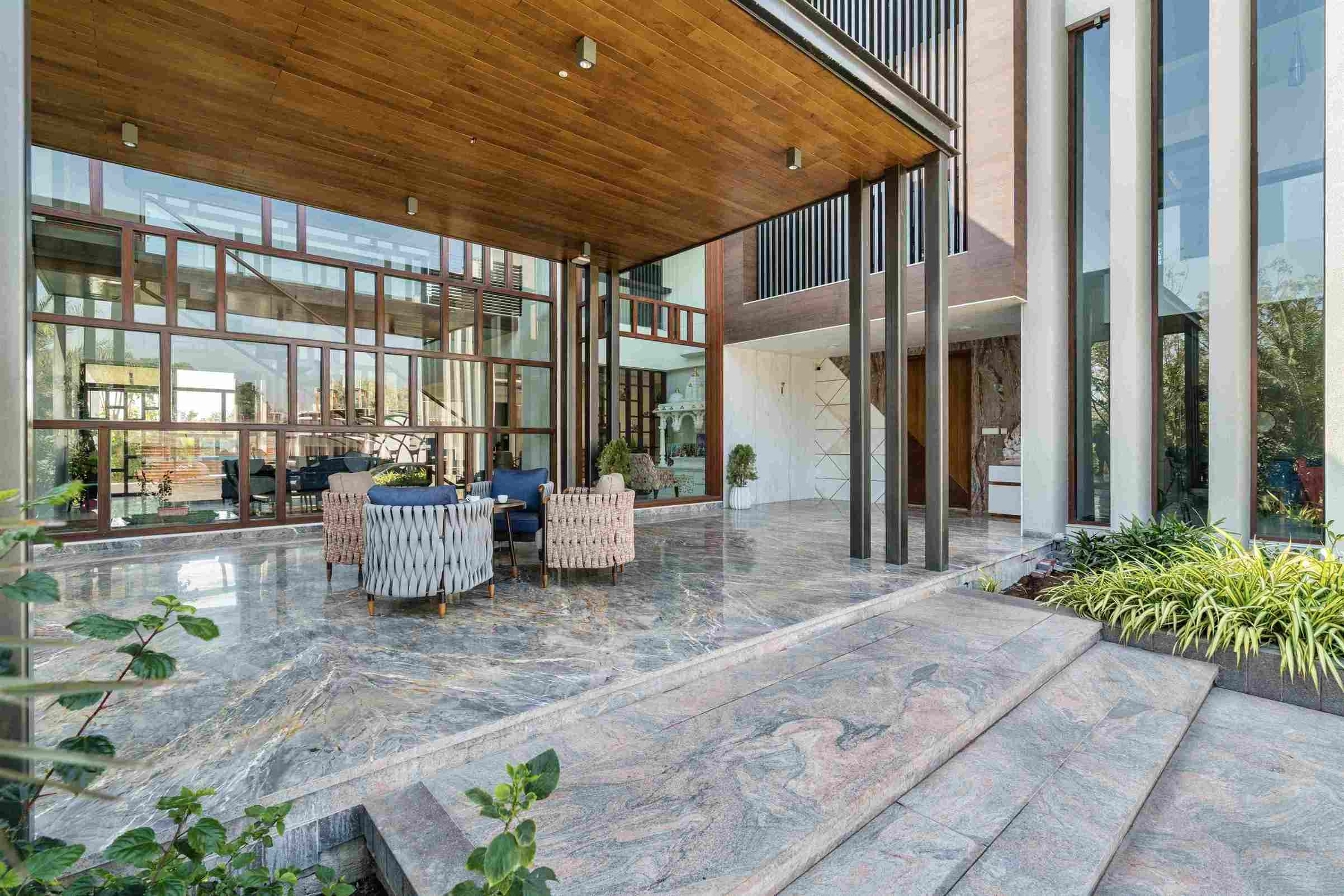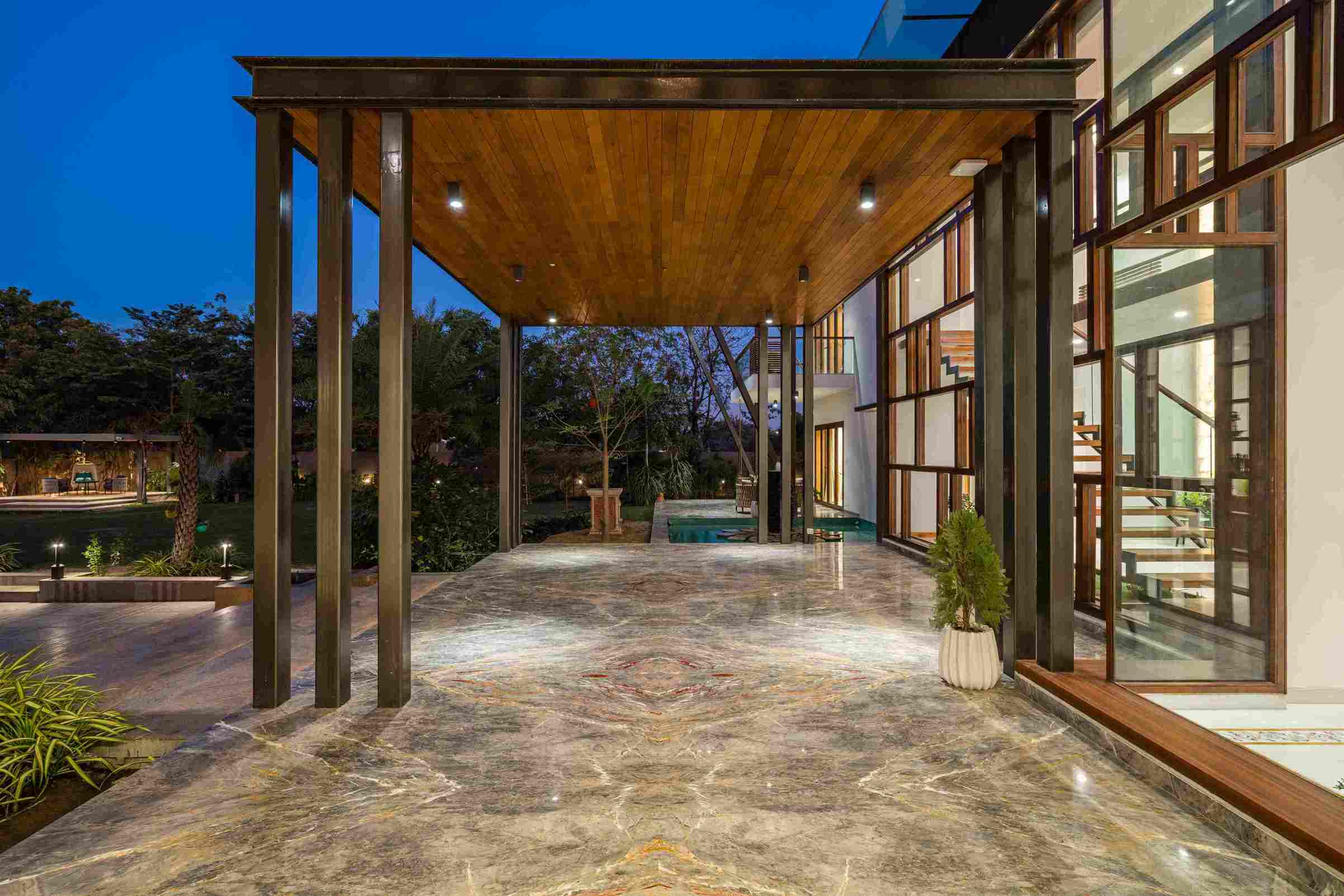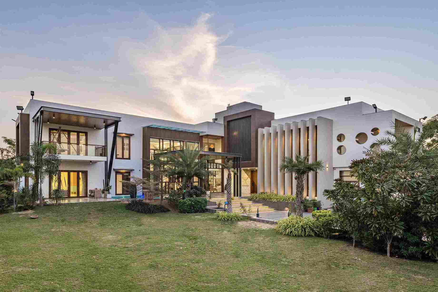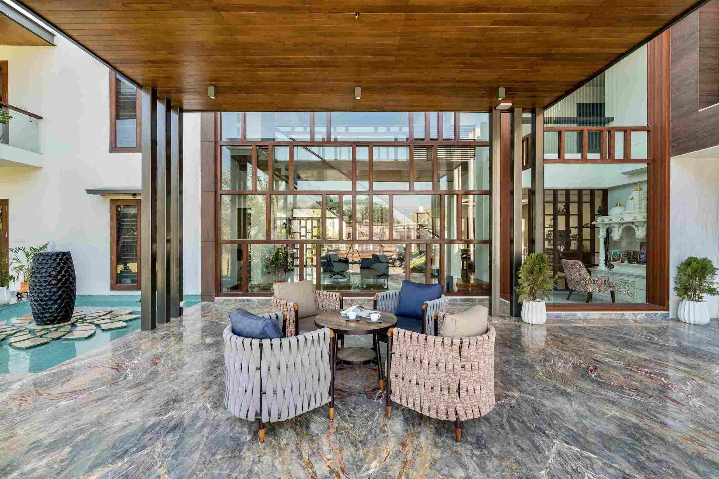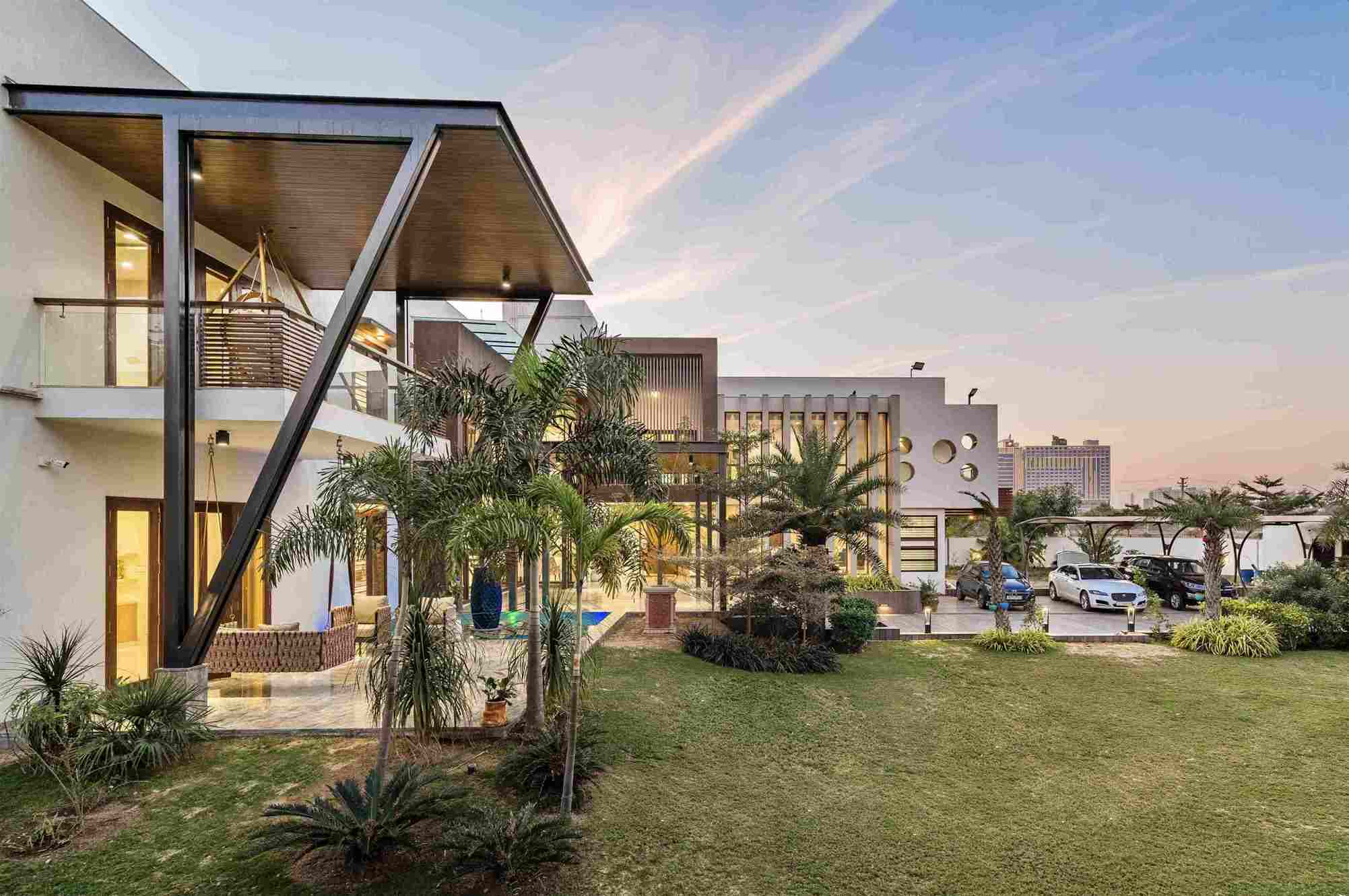 The residence is located in Ahmedabad. The volumes are achieved by the play of mass and void, which creates the pockets of spaces that are utilized for landscape which intern enhances the architecture of the house. The house is at a setback of 25m which accommodates parking and a foyer. Site area of 3000 sq. yards which has a total built-up area of 1100 sq. yards. Also consists of a swimming pool in the backyard with a wooden deck. The foyer is located at the center of the public spaces of the houses. The entrance leads to the primary spaces of the house via a porch connecting with a waterbody and courtyard. One of the key elements is a glass and wooden bridge that is connecting to the master bedroom overlooking the living room. It also features a 5 ft cantilever staircase supporting on a 9-inch R.C.C wall. Most of the enclosed spaces at the lower level are connected with a semi- open space overlooking the landscape. The orientation of the spaces is in a way that optimizes circulation.